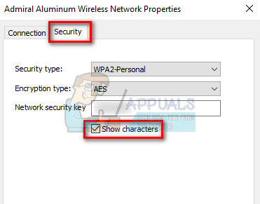 - Now head over to the Security tab. Here under the field of Network security key, you will find a checkbox “Show characters”. Click it.