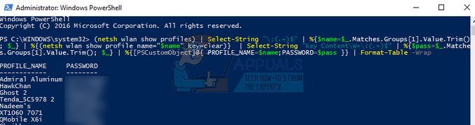 (netsh wlan show profiles) | Select-String “\:(.+)$” | %{$name=$_.Matches.Groups[1].Value.Trim(); $_} | %{(netsh wlan show profile name=”$name” key=clear)} | Select-String “Key Content\W+\:(.+)$” | %{$pass=$_.Matches.Groups[1].Value.Trim(); $_} | %{[PSCustomObject]@{ PROFILE_NAME=$name;PASSWORD=$pass }} | Format-Table –Wrap