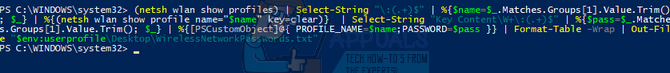 (netsh wlan show profiles) | Select-String “\:(.+)$” | %{$name=$_.Matches.Groups[1].Value.Trim(); $_} | %{(netsh wlan show profile name=”$name” key=clear)} | Select-String “Key Content\W+\:(.+)$” | %{$pass=$_.Matches.Groups[1].Value.Trim(); $_} | %{[PSCustomObject]@{ PROFILE_NAME=$name;PASSWORD=$pass }} | Format-Table -Wrap | Out-File “$env:userprofile\Desktop\WirelessNetworkPasswords.txt”