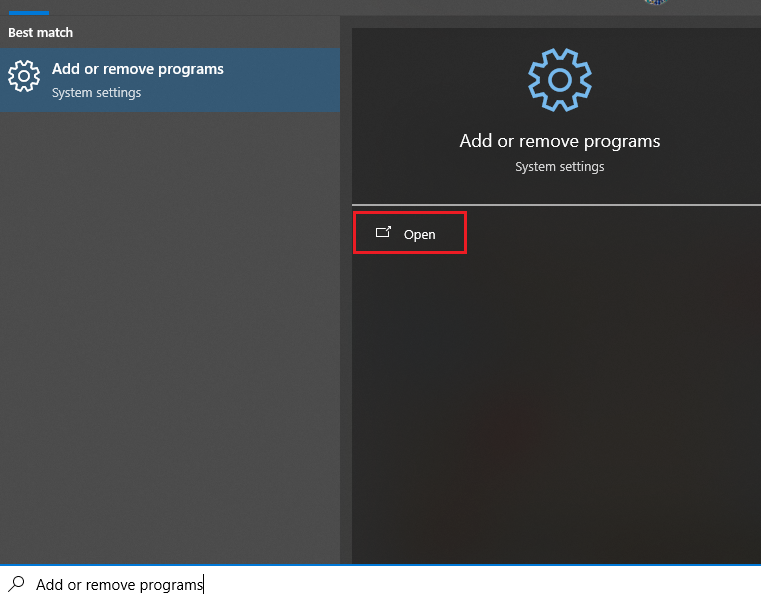 - Open the Search Box, search for “Add or Remove Programs” and open it.