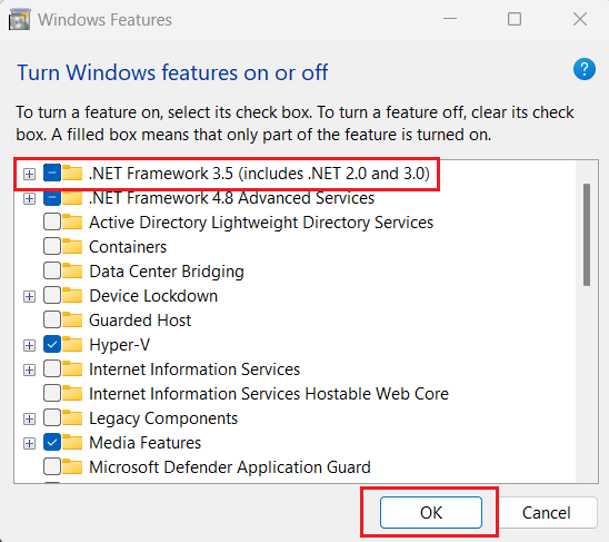 - Check the box next to “.NET Framework 3.5” to enable it.