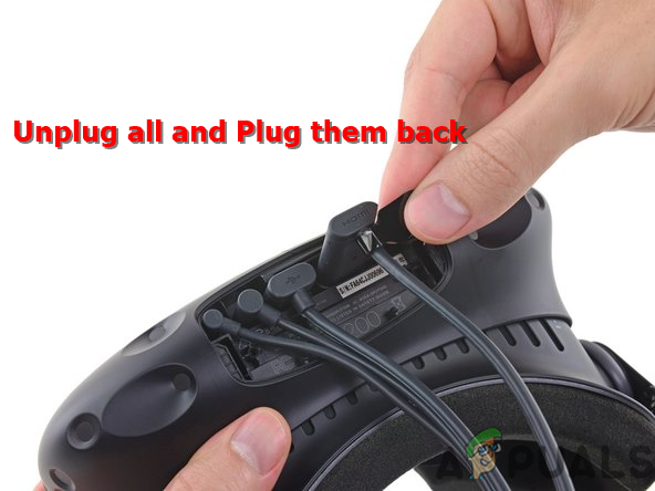 Changing the USB cable to THE other port in the headset - If that doesn’t work, then make sure to unplug all the other cables connected to the HTC Vive headset and plug it back again.