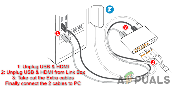 - Unplug the USB and HDMI cables from your PC. Now unplug the HDMI and USB cables from Link Box.