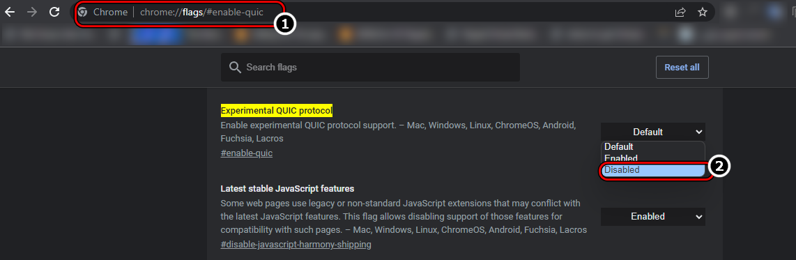 - Now find the Experimental QUIC Protocol and set its dropdown to Disabled.