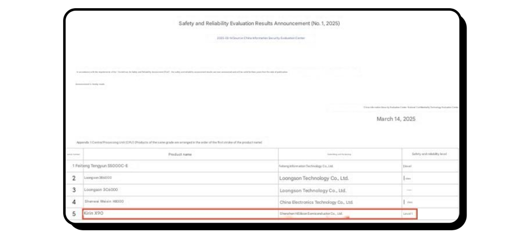The Safety and Reliability Evaluation report for Q1 2025 (published by the China Information Security Center) mentions the HiSilicon Kirin X90, which is expected to be the company’s next PC chip. HiSilicon is wholly owned by Huawei, and as pointed out by leaker @Jukanlosreve, the chip could retain the “Kirin” moniker, previously seen on Huawei’s smartphone line.