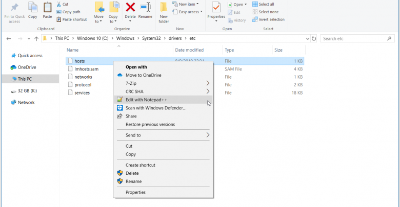 - Right click on file hosts and edit it by using any of Text Editors. In our case, we are using Notepad++