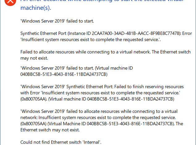 An error occurred while attempting to start the selected virtual machine(s). Synthetic ethernet Port: Error Insufficient system resources exist to complete the requested service. Failed to allocate resources exists to complete resources to a virtual network. The Ethernet switch may not exist.