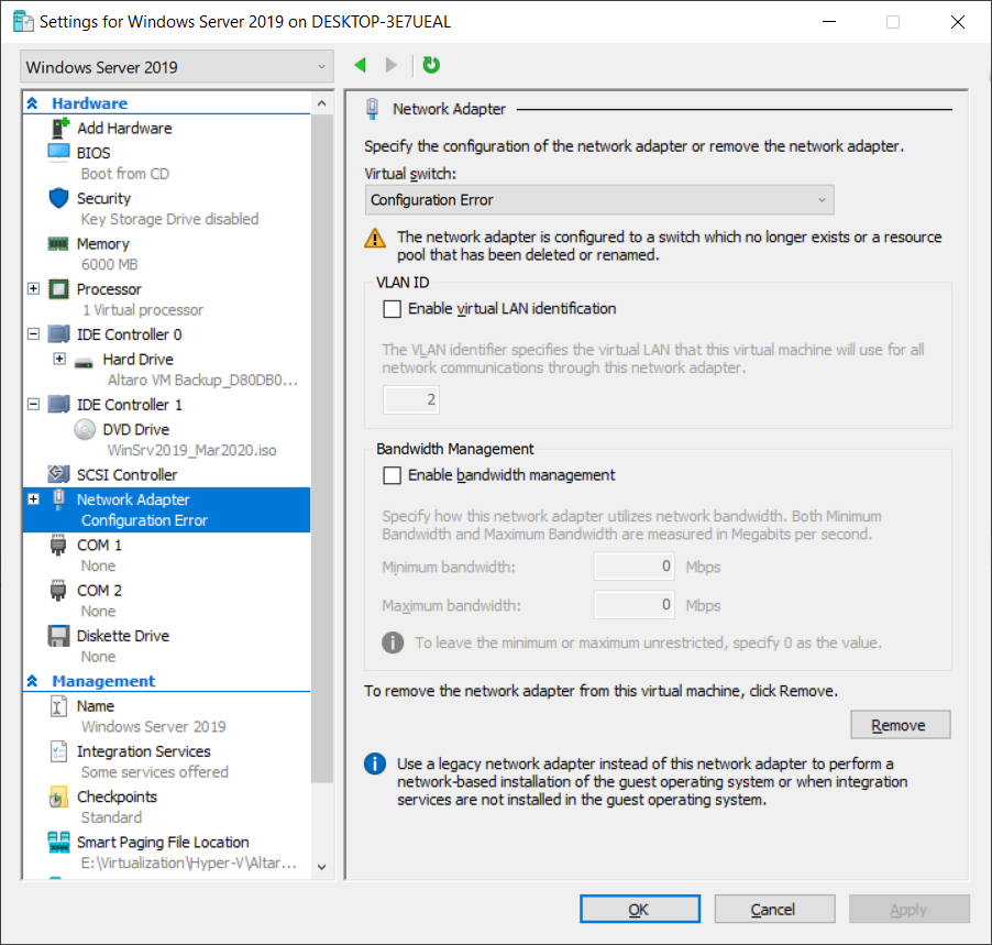 You see on the screenshot below that this Network Adapter has a Configuration Error. We do not see much information here, so we will jump into Hyper-V Manager settings.