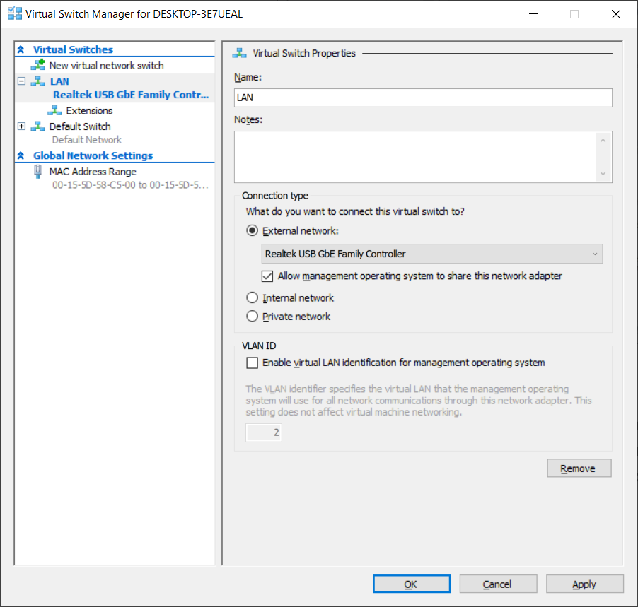 In our case, it is an adapter called LAN. We can see that LAN is an external adapter that is using physical network card Realtek USB GbE Family Controller and it provides communication between virtual machines and the rest of the network.