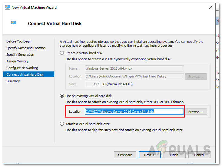 - After that, create a new virtual machine and when asked for a virtual hard disk, choose the Use an existing virtual hard disk option.