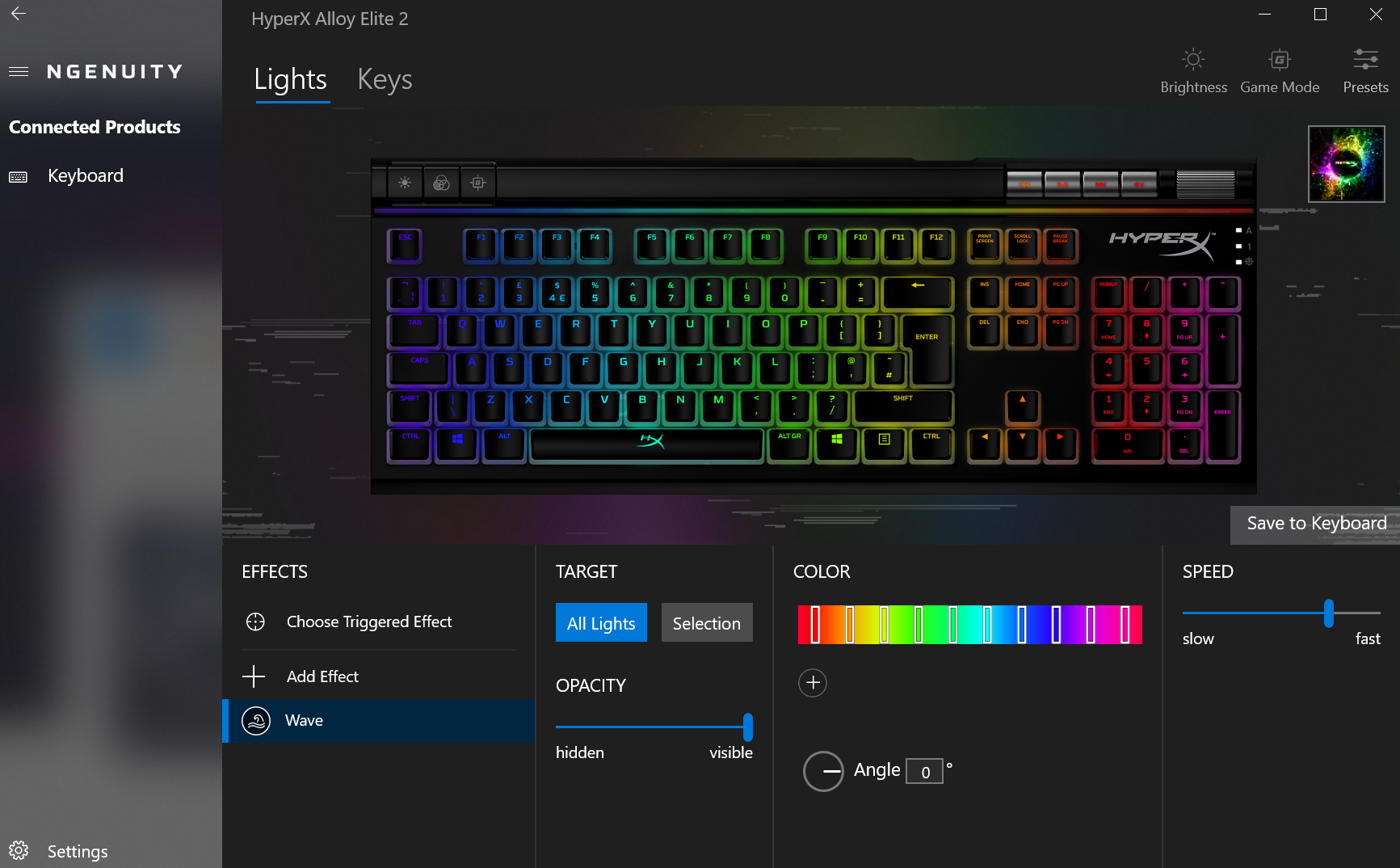 The Hyper X Elite Alloy 2 can be customized to one’s liking via the Ngenuity software. You can choose what type of RGB lighting you want. The hoards of different color combinations along with the different modes of lighting all can be utilized via the Ngenuity software. However, RGB settings are not all they can do. The Ngenuity software gives you the ability to bind specific keys to specific tasks. You can set up gaming profiles and modes. There are a total of 3 on-board memory profiles that you can make. These are all setup through the Ngenuity software. You can also set up the 7.1 virtual sound settings through this software. Once you have made these onboard memory profiles you can switch between them just by pressing the button on the top left of your keyboard.