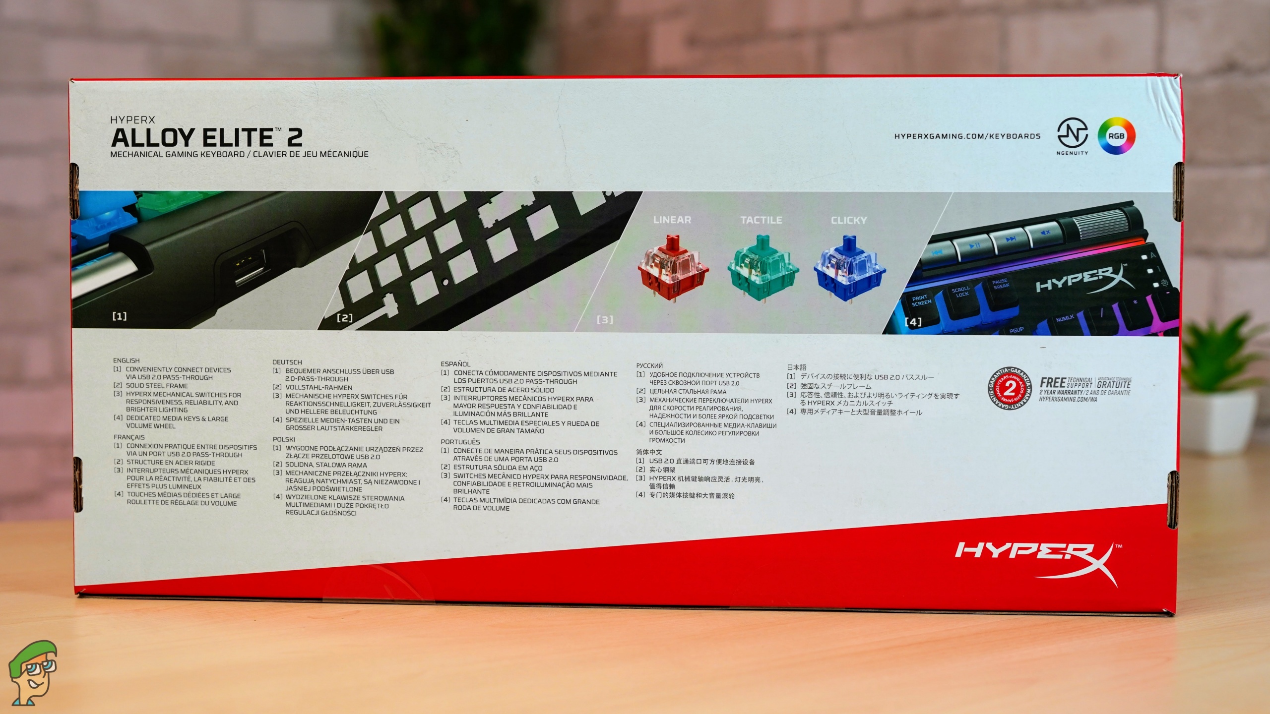 The Hyper X Elite Alloy 2 is packaged in a white box that has a red stripe going across it on its bottom on the front and backside of the box. The rest of the box is full red in color. The front of the box proudly displays the Elite Alloy 2 in all of its RGB glory. While the back of the box gives a few pictures of the keyboard through various angles. There is a plethora of specifications and information regarding the Elite on the back of the box.