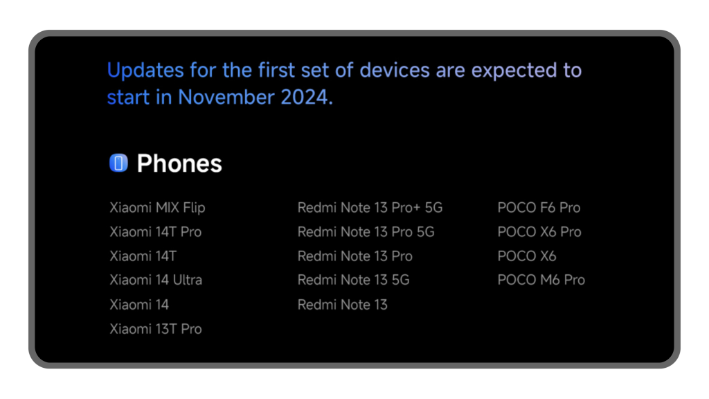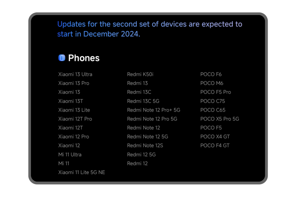 The global rollout will be led by the Xiaomi 14 and Xiaomi 14T series, followed by devices such as the Redmi Note 13, Xiaomi 13T, and the Poco X6 series. In December, the schedule will extend to older devices in the Xiaomi 11, 12, and 13 series, as well as the Redmi Note 12, and the Poco F6, F5, and X4 devices.