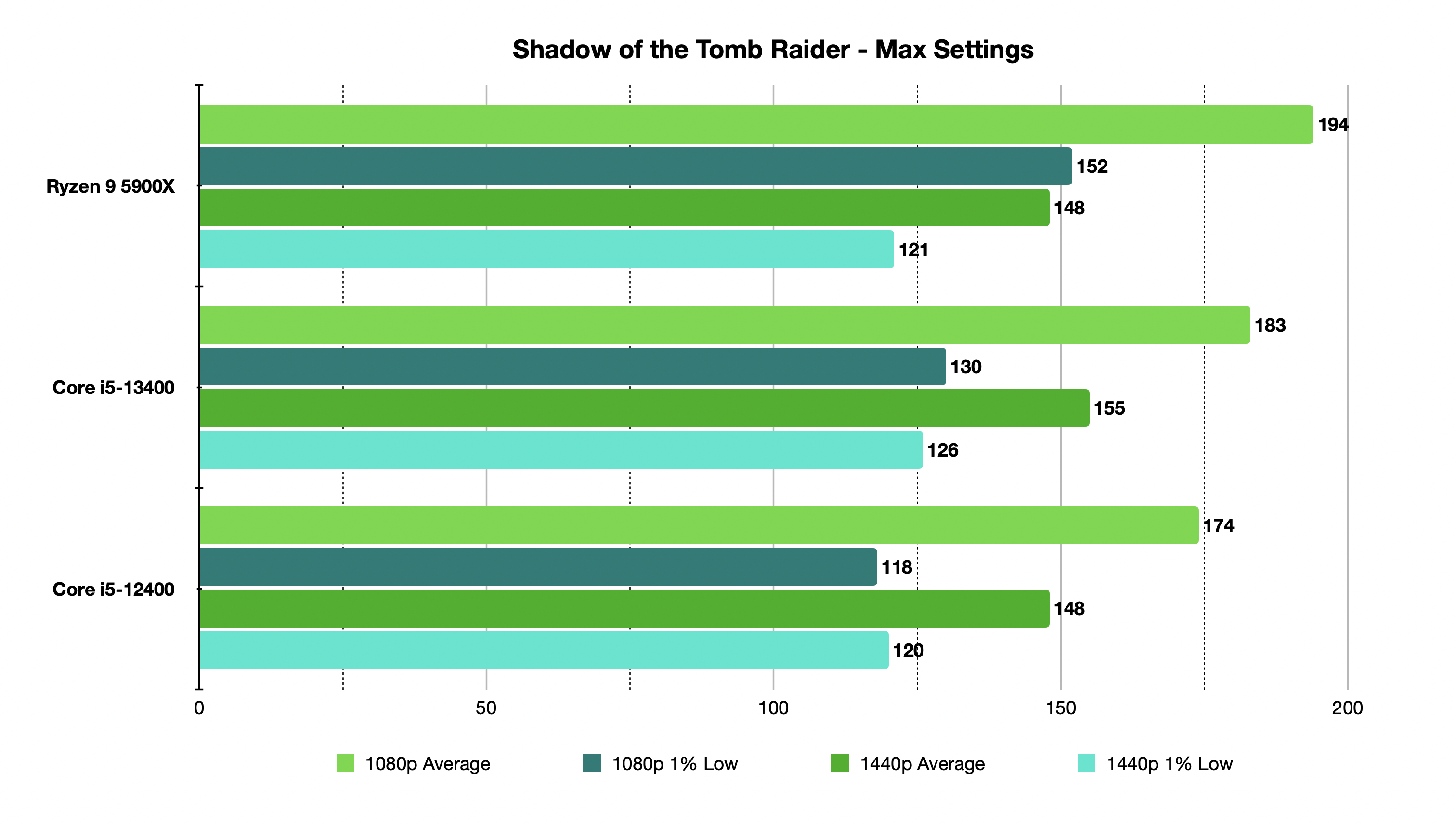 At 1440p, a similar story continues where the i5-13400 easily beats out the i5-12400 by getting 38% more FPS. The race is a lot closer when it comes to the flagships this time around as the GPU takes over to level out the playing field a bit more. Still, the Core i5-13400 manages to pull ahead of the R9 5950X and i9-12900K by 1.1% and 0.82%, respectively, in terms of the frame count.