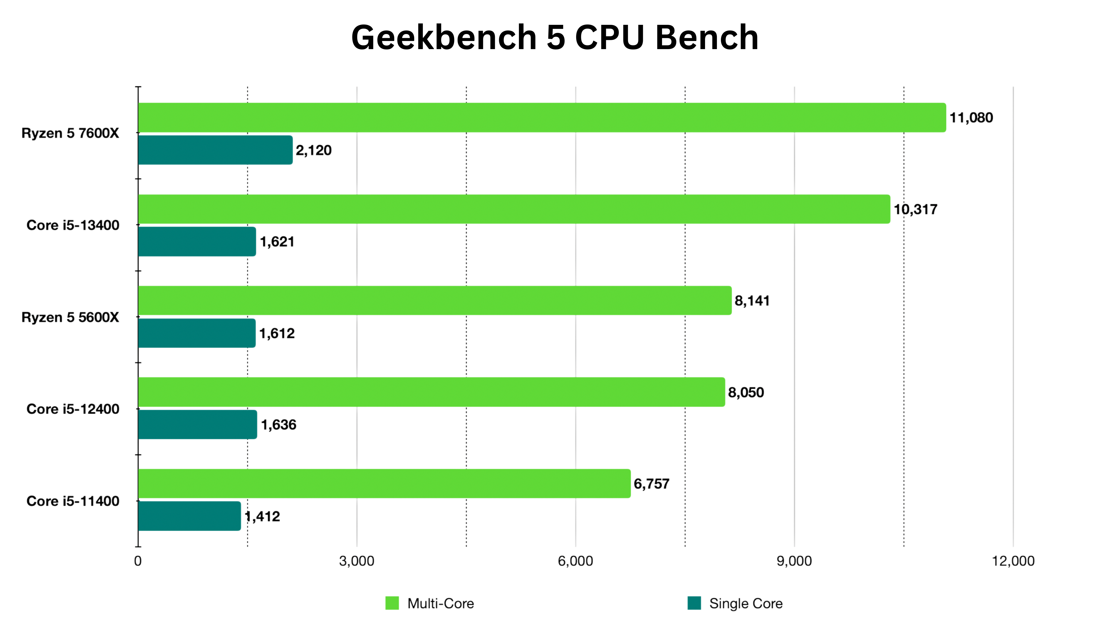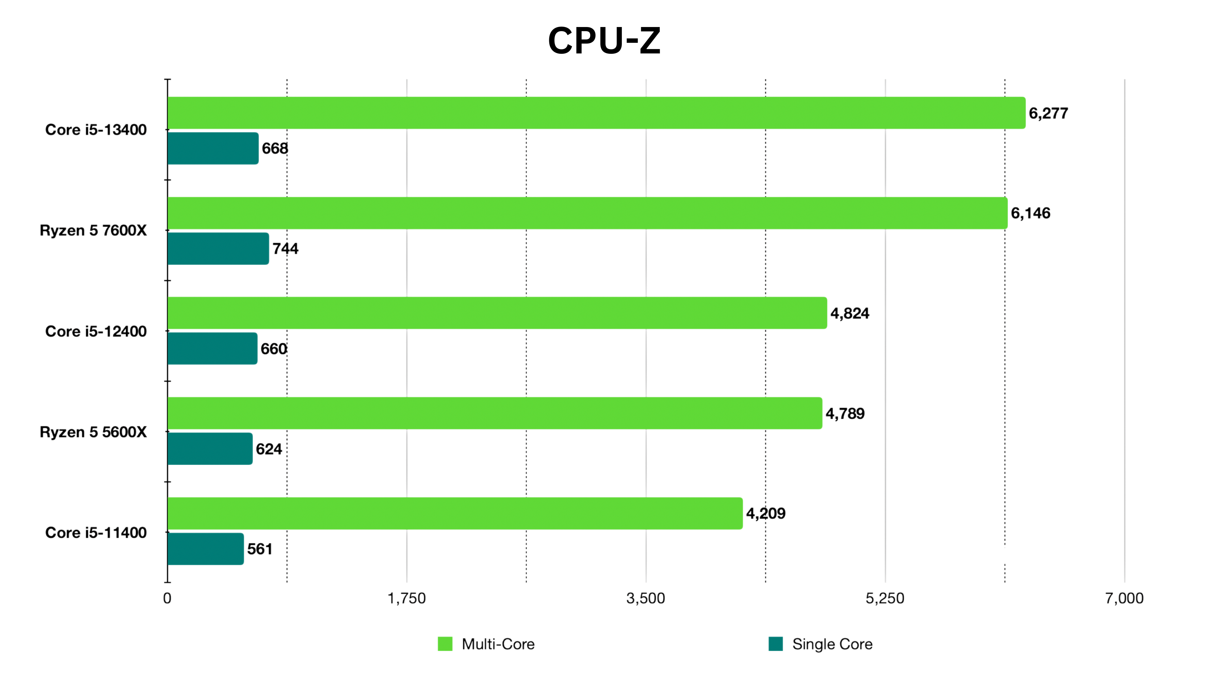 The combination of the best multi-core score and the second-best single-core score barely puts the i5-13400 in first position with a mere 0.8% difference between it and the R5 7600X in our CPU-Z testing.
