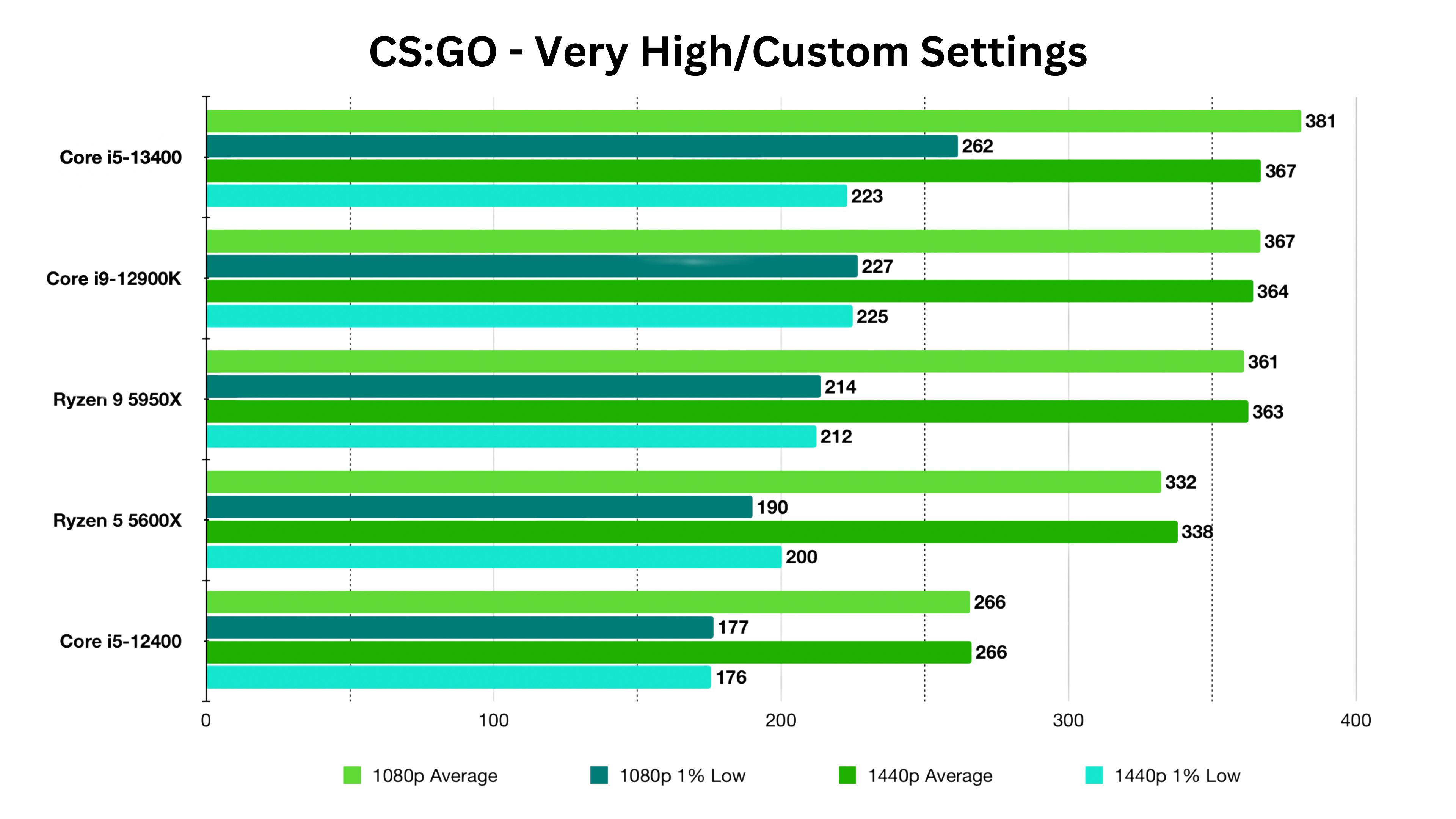 The Core i5-13400 performs well at the 1440p resolution, pushing past every other CPU in the list to output 383 FPS on average. That is 7.6% more than the i5-12400, 7.3% more than the i9-12900K, and 7.83% more than AMD’s Ryzen 9 5950X. As you can see, at 1080p we somehow got worse numbers than our 1440p results despite trying out both DX11 and Vulkan modes, so we’ll stick to 1440p talk only for now.