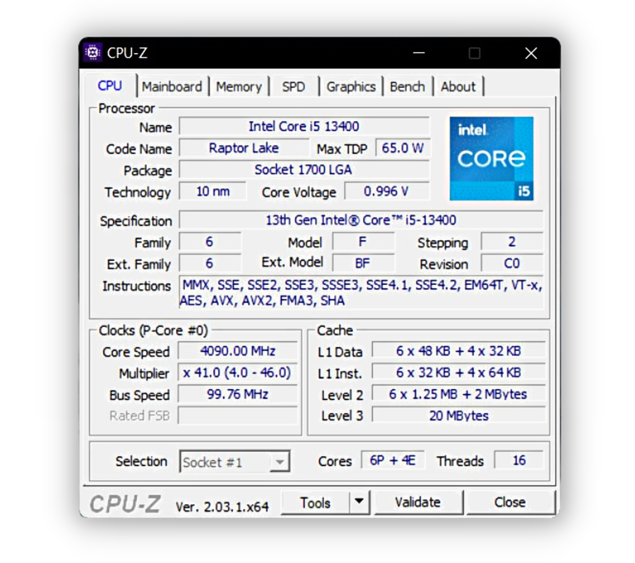 The Core i5-13400 is a 10-core, 16-thread CPU from Intel’s latest 13th Gen lineup. It features 6 Performance Cores and 4 Efficiency Cores, and boosts up to 4.6GHz, which is 200MHz higher than the i5-12400. Moreover, the processor has a 65W TDP and boasts 20MB of L3 cache. As you can see in the CPU-Z screenshot below, our unit boosted up to 4.1GHz in testing.