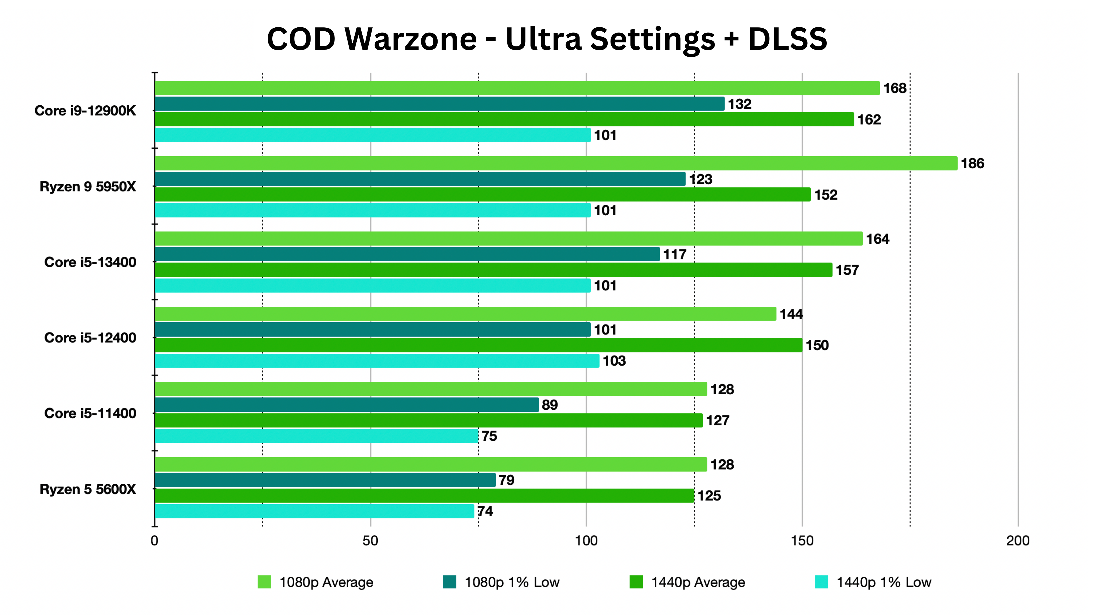 Moving on to Call of Duty: Warzone, a game generally conceived as GPU-intensive, which, in actuality, is one of the best for benchmarking as it requires a strong balance of both the CPU and GPU to avoid bottlenecking. Here, we once again see the i5-13400 stand toe-to-toe with the big boys, while edging out its Alder Lake counterpart by almost 14% at 1080p resolution.