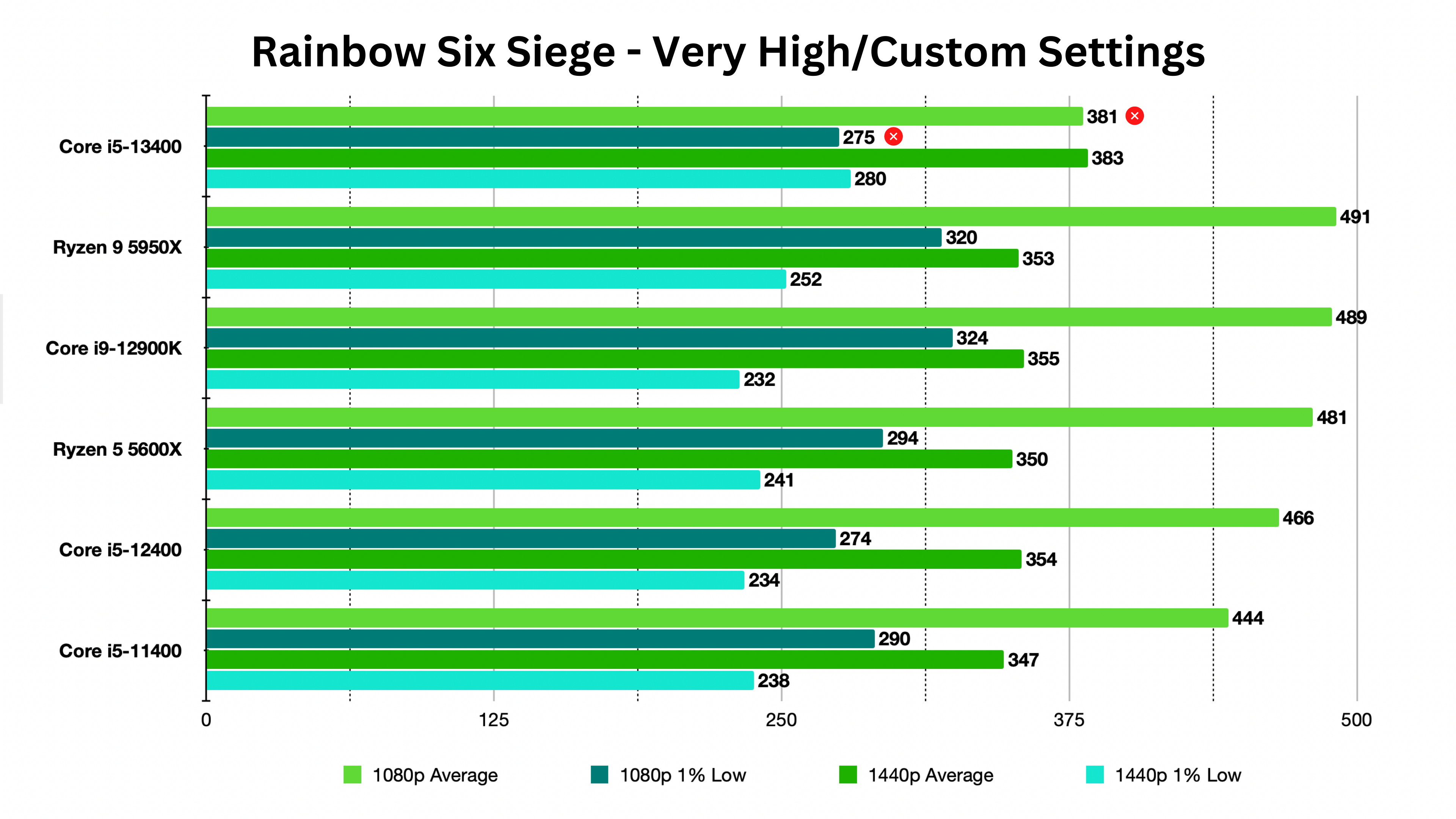 In addition, at 1440p the Raptor Lake CPU is 9.6% faster than its Alder Lake counterpart. There is a 10% difference between the R9 5950X and the i5-13400, but most of that comes from the 1440p numbers, where the GPU takes over.