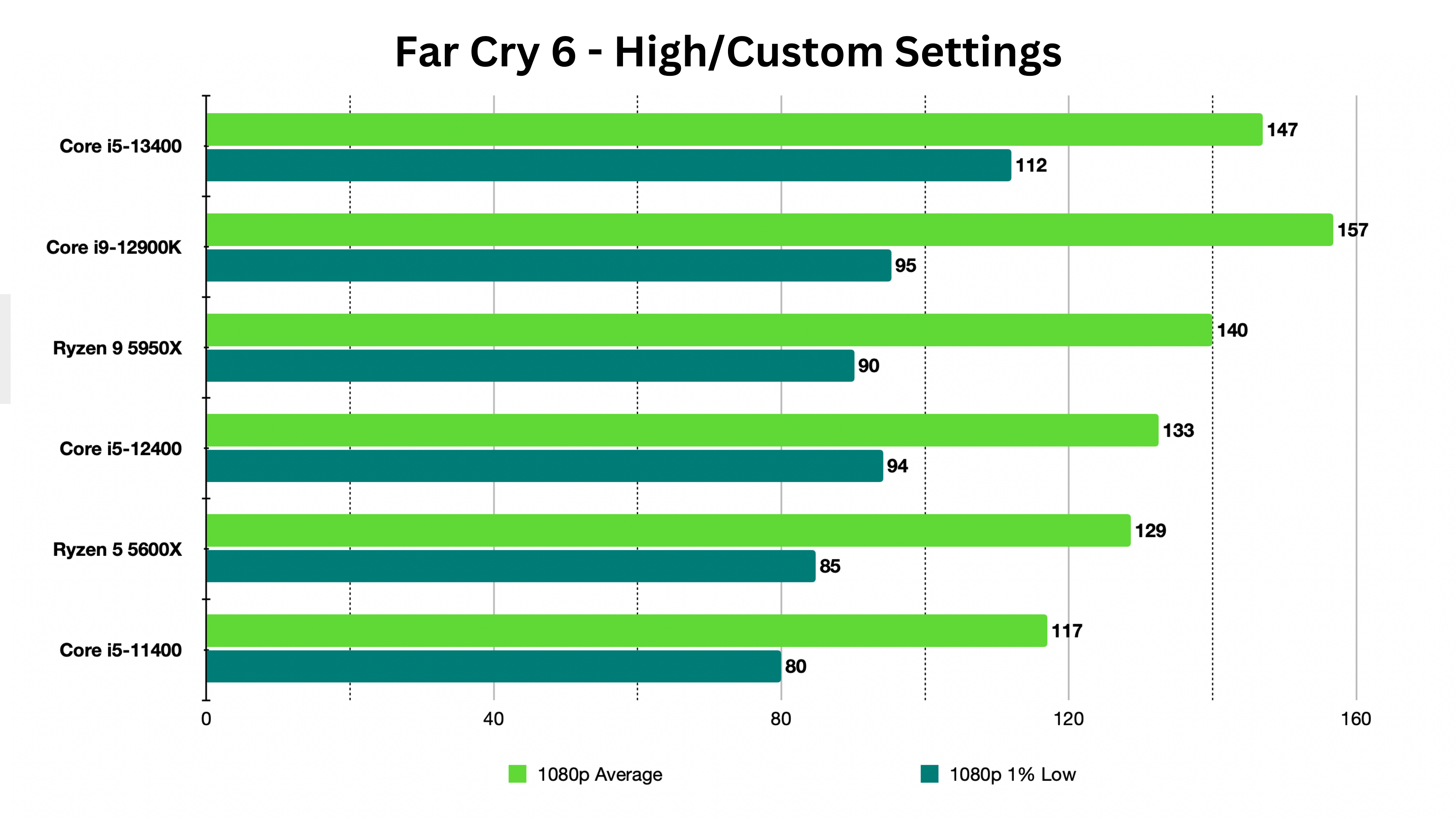 At 1080p in Cyberpunk 2077, the Core i5-13400 produces 1 more frame than the Ryzen 9 5950X and 2 more frames than its predecessor, the i5-12400. Overall, the i5-13400 is the best out of every CPU here, and 4% faster than the i5-12400. But looking at the chart below, you can tell that every CPU performs adequately, producing well over 150FPS. The Core i5-11400 falls short at 149 FPS, making it 16.1% slower than the Core i5-13400.