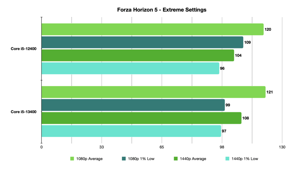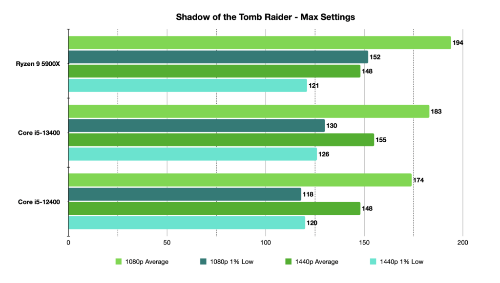 At 1080p, the i5-13400 was 3.3% faster than its predecessor, and at 1440p it was 3.4% faster. Just for context, the i5-13400 wasn’t as strong against the Core i9-12900K as it were in some other games, and was outdone with 9.2% better score overall from the flagship SKU.