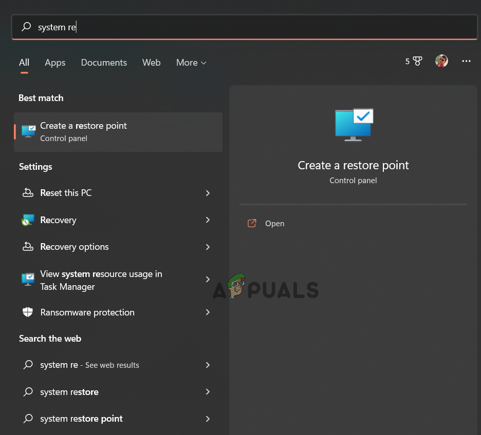 - After that, in the search box, type System Restore.