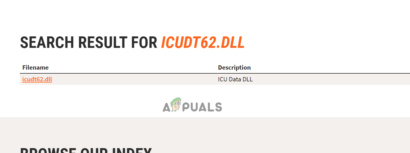 Search for icudt62.dll file - Now from the list of results that appears, look for the icudt62.dll link.
