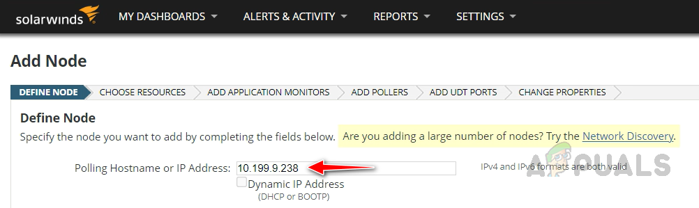 - On the Add Node page, provide the IP Address of the device that you want to add to monitoring.