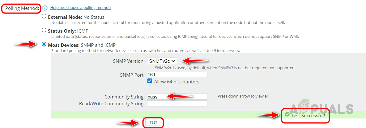 - In Polling Method, choose Most Devices: SNMP and ICMP and select your preferred SNMP version. Here, I am choosing SNMP v2 since I configured my network device using SNMP v2. Provide the Community String and click on Test to validate whether Solarwinds can communicate with the device using SNMP. The test result should be successful to proceed further.