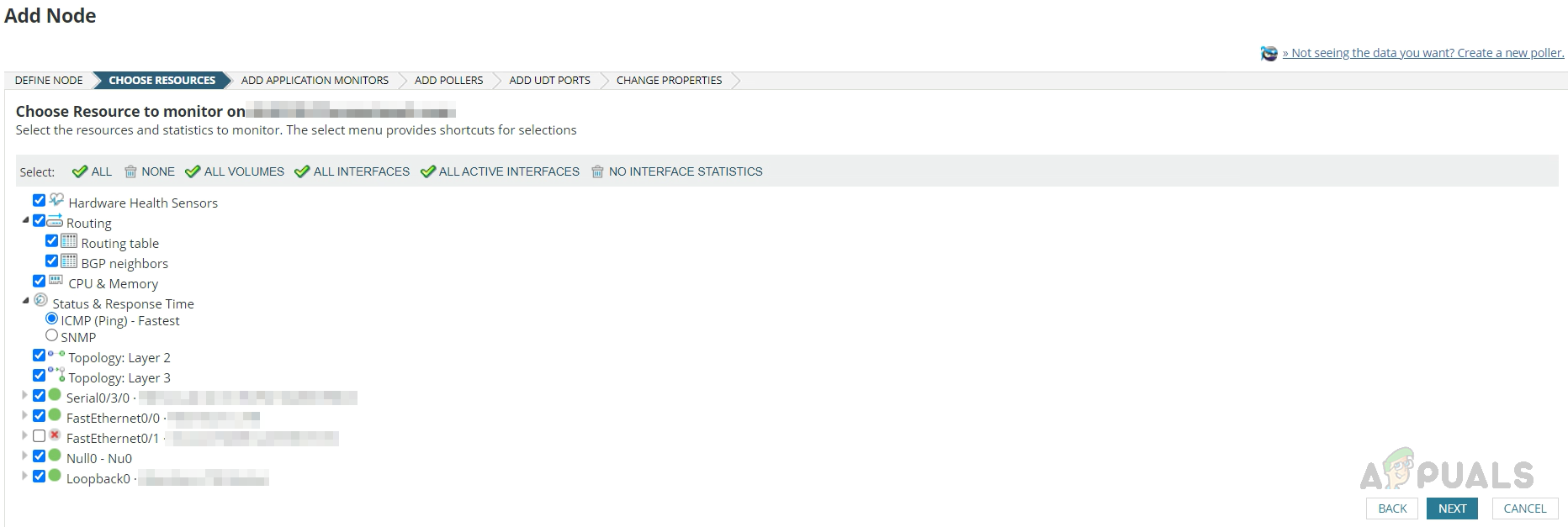 - On the resources page, select the necessary resources, including the interfaces you want to monitor, and then click Next.