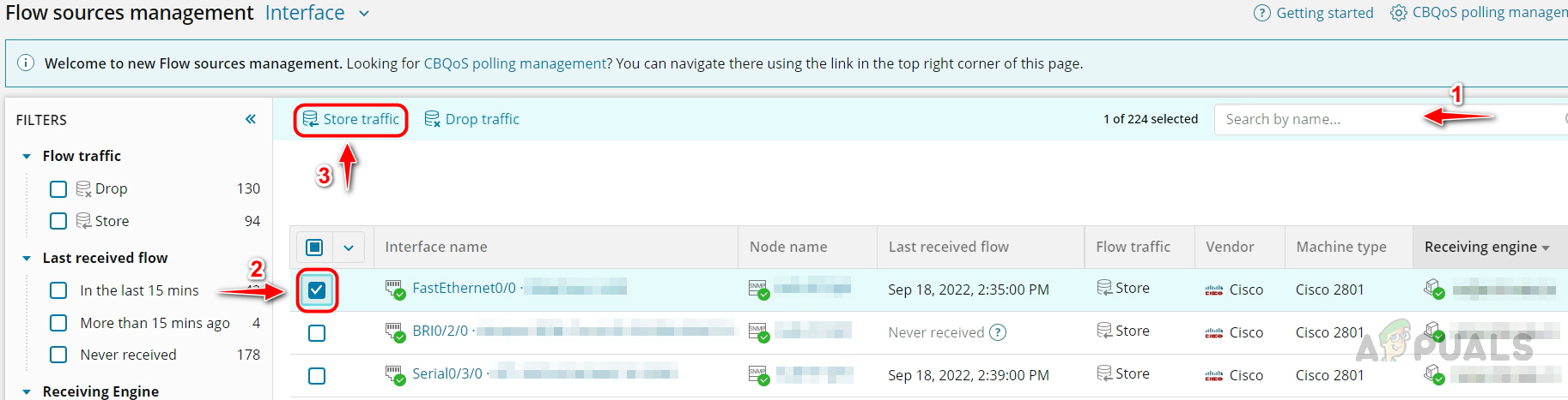 - Search for the node, select the interface that you want to store NetFlow data, and then click on Store Traffic. NTA will start store the NetFlow data sent by interface.