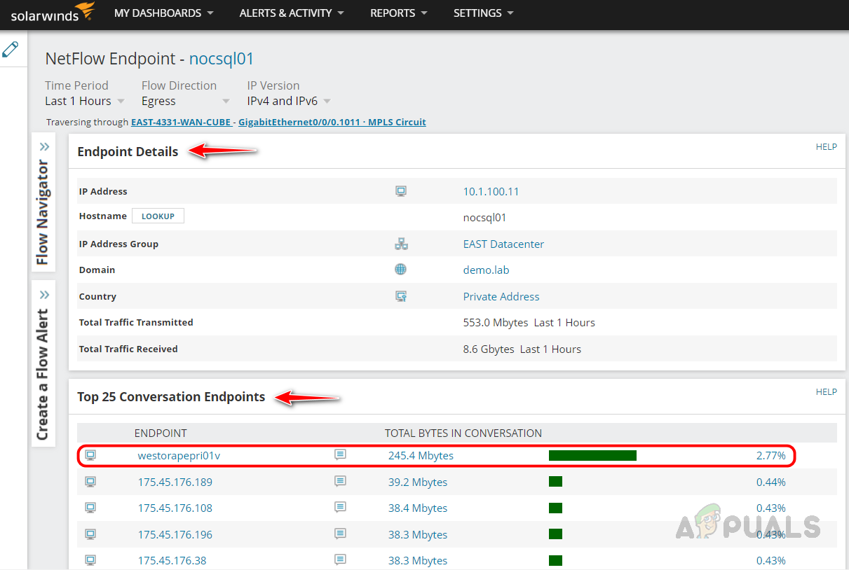 We have everything in place to monitor the interface’s bandwidth utilization and NetFlow data. Whenever we receive a high bandwidth utilization alert for this interface, we can identify the cause in Solarwinds NTA to fix this. Let’s see an example on how to check in Solarwinds NTA.