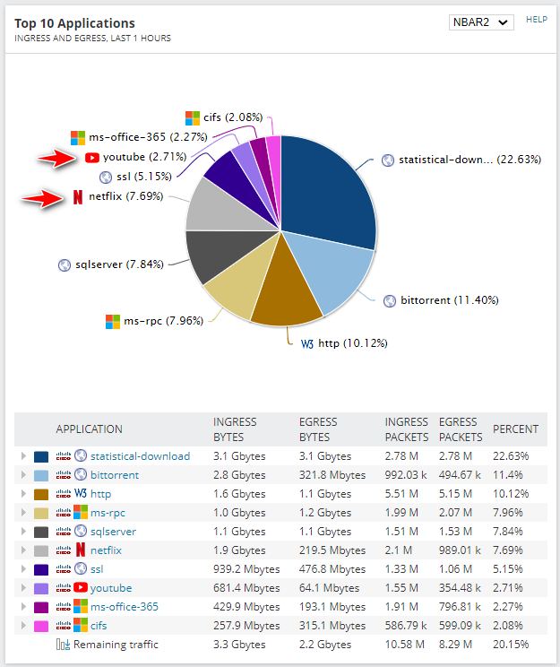 - Apart from this, there is a widget called Top 10 Applications; there, we can see all the applications-related traffic; in the below example, you can see YouTube and Netflix. They are unwanted traffic on a production hour.