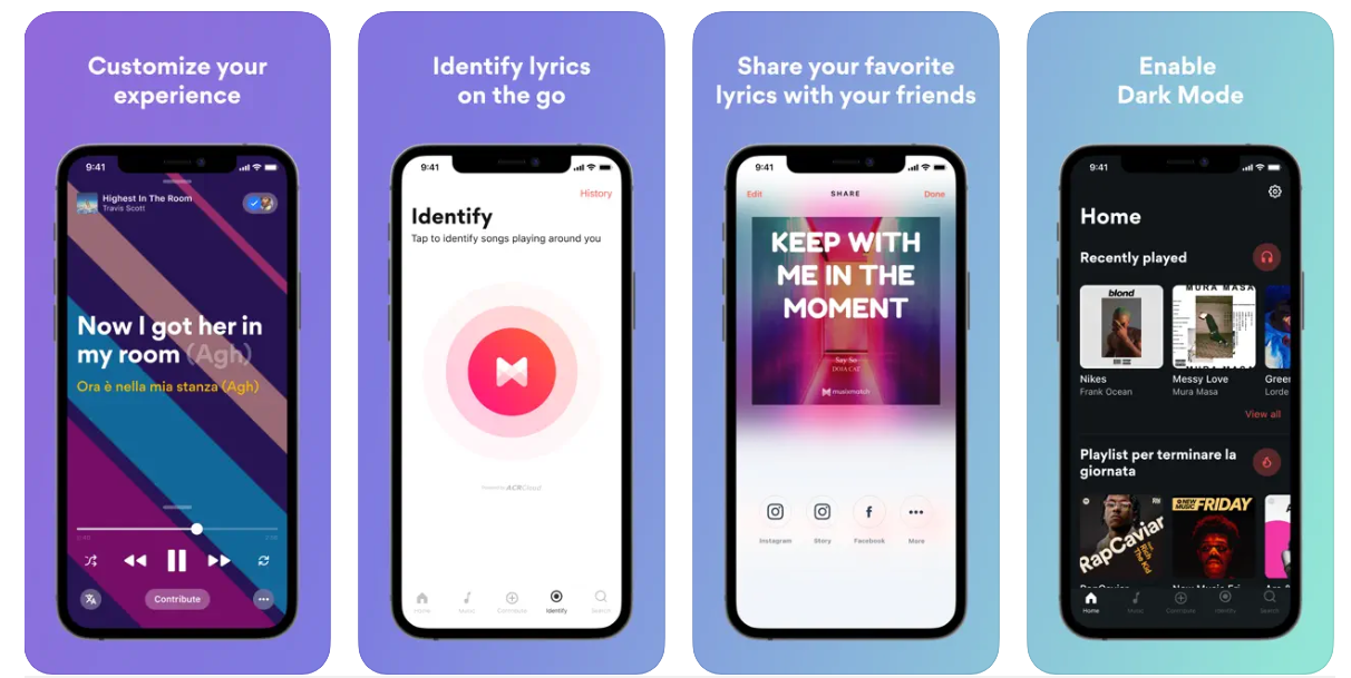 You can use Musixmatch Lyrics to rapidly recognize songs playing nearby while viewing the lyrics on your device. The app does more than identify songs; it also serves as a music player that displays song lyrics. Click the “Identify” tab at the bottom bar, and then tap the Musixmatch button to utilize the program for music recognition. It is also available on both Android and iOS.