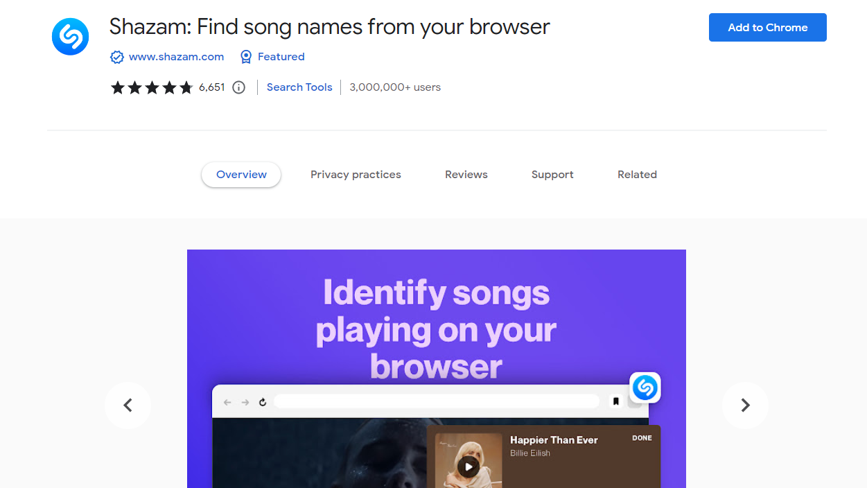 Shazam’s Chrome extension is available for users of Google Chrome which can be used to identify songs. The main advantage is that it can recognize music without using your microphone. Click the Shazam symbol in any tab while playing the audio file (or a video with music playing). It will recognize the song for you.
