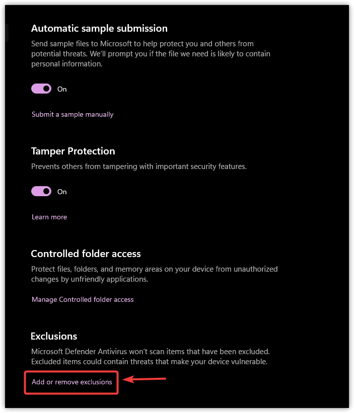 - Scroll down and click Add or remove exclusions.