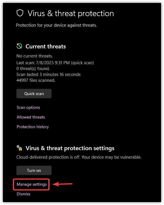 - Under Virus & threat protection settings, click Manage settings.