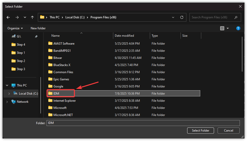 - Select the IDM folder and click Open.
