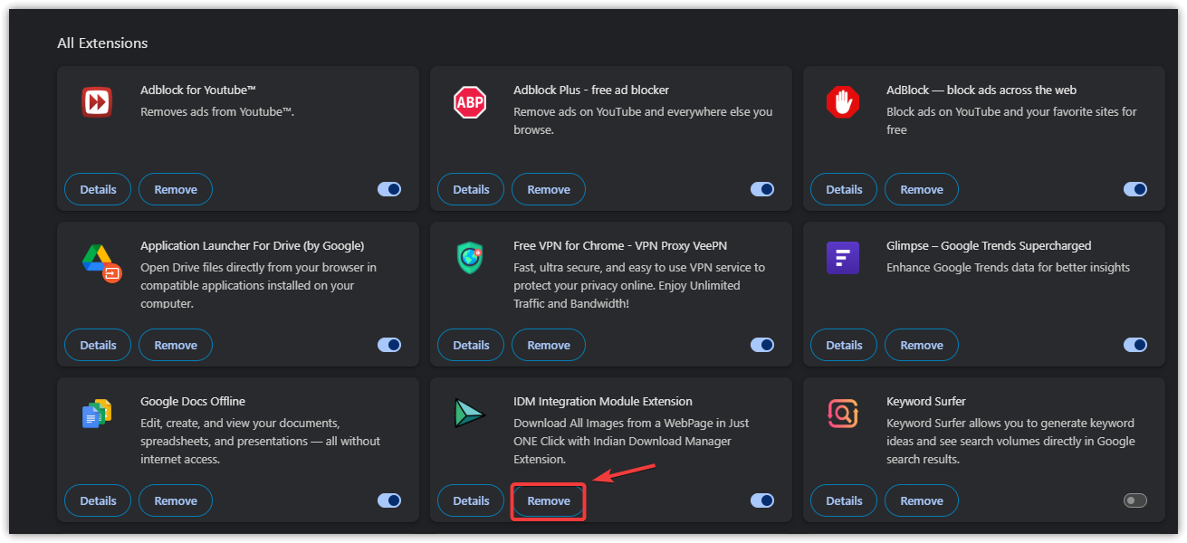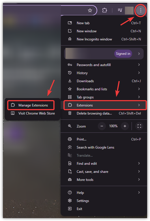 - In Chrome: click the three dots at the top-right corner and go to Extensions > Manage Extensions.
