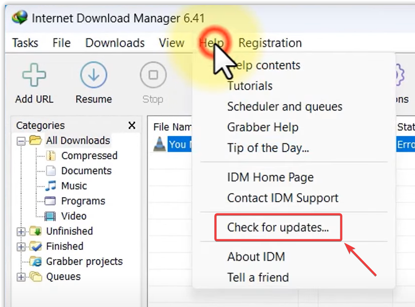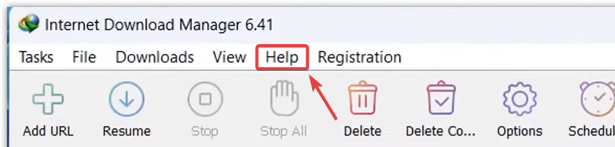 - In the IDM window, click the Help menu at the top.