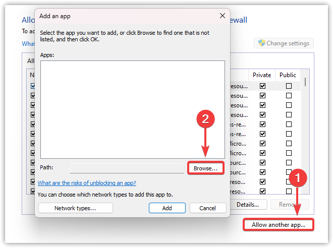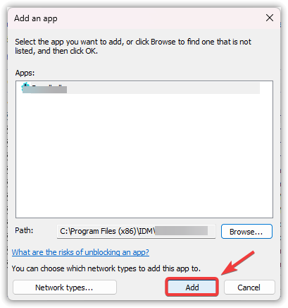 - If it’s not listed, click Allow another app, then Browse to IDM’s installation folder: