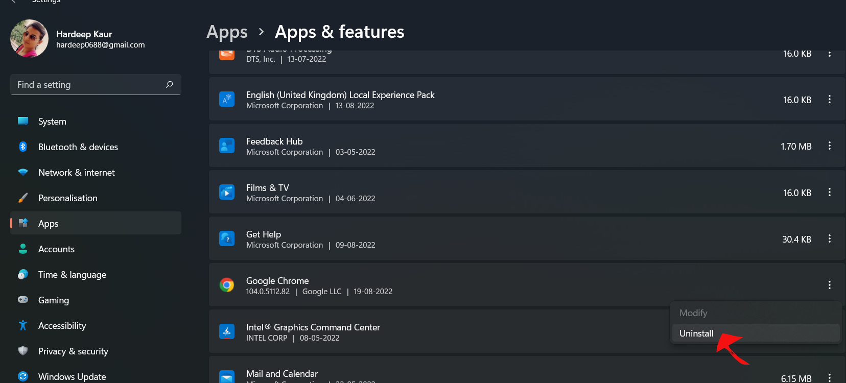 Inside the Windows, Settings accessing the Apps & features section - Now click on the 3 dots beside the Chrome browser and then click on the Uninstall option.