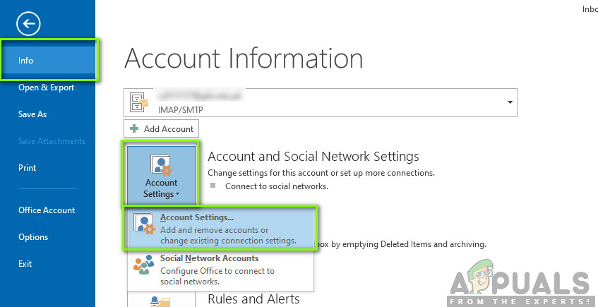 - Open your Outlook program and click on File from the ribbon bar at the top. Once you get there, go to the Info tab and click on Account Settings > Account Settings.