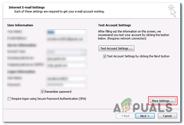 Click Change in Outlook Account Settings - After you get to the next menu, click on the More settings button (bottom-right section of the screen).