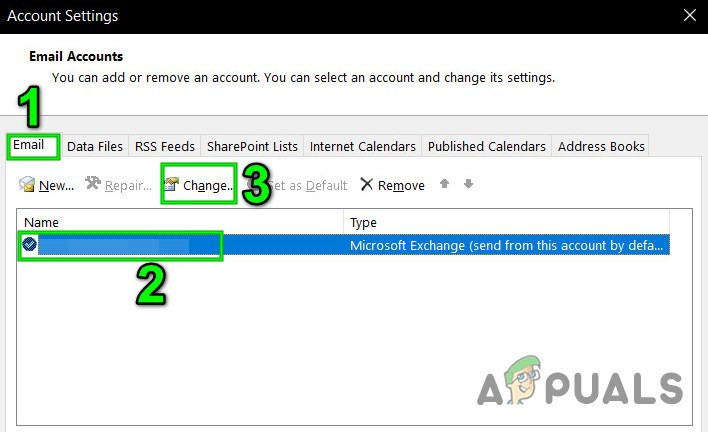 Accessing the Account Settings menu of Outlook - From the Account Settings menu, click on the Email tab, then select the email that you’re having issues with and hit the Change button from the list of context options available.