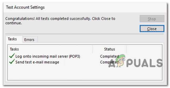 Testing the POP email connection - If you get a success message, you have successfully managed to connect with GMAIL POP and eliminated the 0x800CCCDD error.