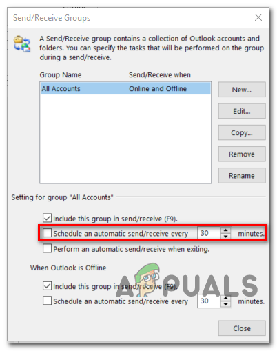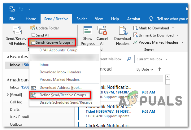 - Error is triggered by Send/Receive Groups – Most commonly, this error will be caused by an outlook feature called Send/Receive Groups. In this case, you can fix the issue with no repercussions simply by accessing the Send/Receive Groups settings in Outlook and turning the feature off.