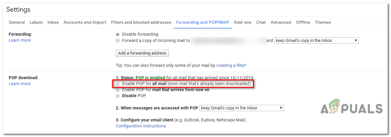 Accessing the POP/IMAP settings - Next, scroll down to the POP download section and select the toggle named Enable POP for mail that arrives from now on.