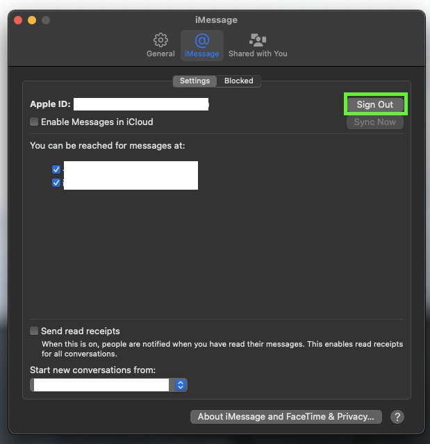 Opening iMessages preferences - Click on Sign-out in front of your Apple ID and restart your Mac. Wait for 10 minutes before proceeding.