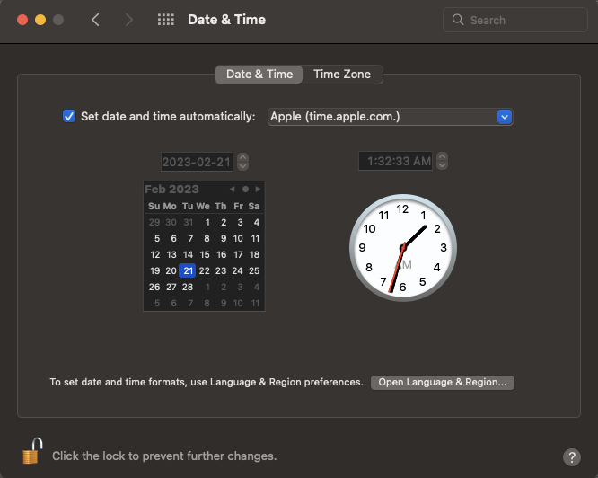 Open Date & Time in Mac’s System Settings - Make sure the date, time, and time zone settings are correct. Make changes if necessary and restart your device.
